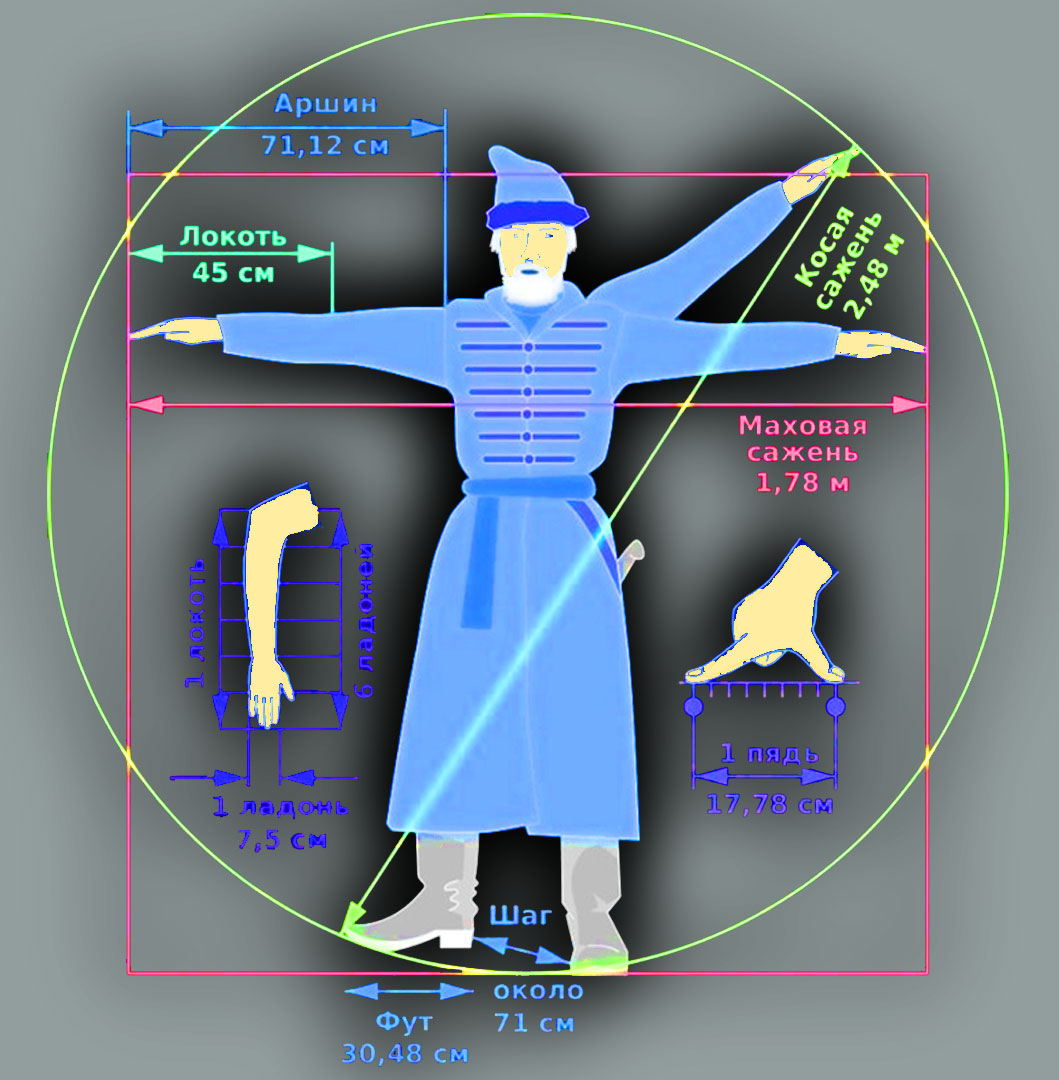Вершок ~4,45 см В старину, говоря про рост человека в вершках, имелся в виду рост плюс 120 см. Так, рост 7 вершков означал ~151,15 см. Пядь 17,8 см =4 вершка. За пядь было принято расстояние от большого до указательного пальца. Локоть 35,6 см = 2 пяди, = 8 вершков В литературных памятниках встречается с XI века. Длина локтя определялась как расстояние от конца вытянутого среднего пальца руки до локтевого сгиба, могла варьироваться до 46 см. Аршин 0,71 м = 2 локтя = 4 пяди = 16 вершков Сажень 2,13 м = 3 аршина = 12 пядей = 48 вершков. Изначально расстояние от конца пальцев одной руки до конца пальцев другой. Обе руки при этом расположены горизонтально. В начале XIX века приравнен к 7 английским футам. Косая сажень 2,48 м Исторически возникла как мера расстояния от кончиков пальцев вытянутой вверх руки до пальцев противоположной ей ноги. Верста 1,06 км ~ 500 саженей От высоких верстовых столбов времён Алексея Михайловича происходит выражение «коломенская верста», об очень рослом человеке. Верста межевая (доп.) 2,12 км = 1000 саженей 2 версты Поприще 21,2 км = 20верст Встречается, к примеру, в житии прп. Сергия Чудотворца, написанного Епифанием Премудрым.