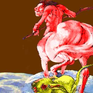Караконджал - караконджул, караконџол, караконџула: «чёрный оборотень, упырь» — сверхъестественное существо, имеет южнославянское происхождение: святки, называвшиеся у восточных славян словом «Карачун - Корочюн», у болгар носили название «Каракончо», и в таком значении слово заимствовали греки, поверья о котором известны туркам и грекам, а также сербам, македонцам и болгарам, находившимся в контакте с ними. Считается преимущественно сезонным, святочным демоном. Восточнославянскими аналогами караконджулов являются шуликуны и кикимора. Считается, что они выходят из воды или из пещер и нечистых мест на период от Рождества, иногда от Игнатьева дня, до Крещения или Бабина дня. Сербы полагают, что караконджул появляется осенью. На северо-востоке Болгарии его уподобляют святому Тодору и временем его вредоносных действий считают первую неделю Великого поста. Повсеместно караконджул — ночной дух, исчезающий с первым криком петухов. Нередко отмечается связь с водой, особенно у сербов и черногорцев. По внешним признакам и функциям уподобляется другим мифологическим персонажам: вампиру, волколаку, оборотню, которые вместе со всей нечистой силой активизируются в святки. Видеть его могут только люди, рождённые в субботу. Караконджалы, караконджулы, караконджо – ночная нечисть, водяные демоны у южных славян. На Рождество они появляются из воды, выходят из пещер. Представляли их в образе коней с человеческими головами, с руками и крыльями или в образе голых людей, покрытых колючей шерстью красного или черного цвета. Считалось, что они могли показываться в подобии пса, овцы, теленка и сманивать людей на околицу села, к речке в ночную пору. Потом нападают, садятся верхом и ездят до первых петухов, гоняют человека вокруг села или берегом реки. Караконджалы боятся огня, железа, пепла от бадняка, хлеба, соли. Является водяным демоном в болгарской, сербской мифологии. Он выходит из воды в период со июня до января после полуночи появляется из воды или пещеры и нападает на прохожих. Катается на них верхом вокруг деревни, поля, по берегу реки до первых петухов. Носит так же название «караконджал», в Сербии - «караконджо». Его происхождение приурочивают к святочным праздникам: верят, что это души заколотых к празднику свиней. Такое же название носят и рожденные и умершие в этот период дети. Их довольно часто ассоциируют с вампирами (покойник, через тело которого прыгнула кошка до погребения или перелетела птица). По другим поверьям ими становятся по наследству живые люди, в последствии, обитающие на кладбищах, в глухом лесу, в ущелье и оврагах. В том доме, куда Коракунджул проникает через дымоход он мочиться на огонь или в незакрытые сосуды с водой. Если его моча попадет на ребенка, то он заболеет неизлечимой болезнью. Может заглядывать в окна и указывать на человека, которому предстоит вскоре умереть. Он мучает скотину, запутывает хвосты лошадям. Когда их собирается по нескольку штук вместе, то они устраивают веселые застолья, справляют свадьбы, водят хороводы. Если Караконджул недоволен чем либо - он начинает пищать в дымоходе, стучит в двери и по крыше. Человеку следует носить при себе огонь, железо пепел или хлеб, дабы обезопасить себя от этого демона. Маленьким детям зашивают чеснок в одежду. | |