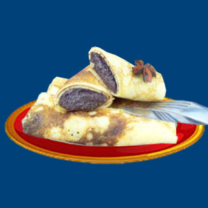 Начинить блинчики маком. Перевернуть стопку блинов обратной стороной и на один край блина наложить несколько блинчиков.