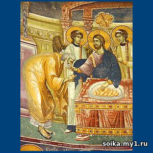 Злаковая крупа, иногда с солью, дрожжами, Евхаристия, фреска, XIV век маслом, водой и специями
