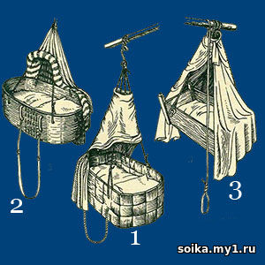Плетенные колыбели (из лозы, льна, соломы). Все четыре вида колыбелей имеют одну общую черту – это подвесные колыбели. Более поздней традицией следует считать появление детских кроваток на гнутых ножках.