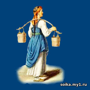 Коромысло - приспособление для переноса ведер, бадеек, корзин. Изготавливалось из липы, осины, ивы, древесина которых отличается легкостью, гибкостью, упругостью. На Руси наиболее широко были распространены гнутые коромысла. Их выгибали из распаренной древесины, придавая форму дуги. Коромысло такого типа удобно располагалось на плечах женщины, придерживавшей его руками.