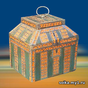 Под железную оковку таких коробов в XVII–первой половине XVIII в. часто подкладывалась светлая или окрашенная в зеленый цвет слюда. Наряду с коробами, декорированными металлом, были широко распространены короба, украшенные росписью – на боковых стенках и верхней плоскости крышки. Роспись выполнялась обычно темперой, поверхность лубяного короба предварительно несколько раз олифилась.