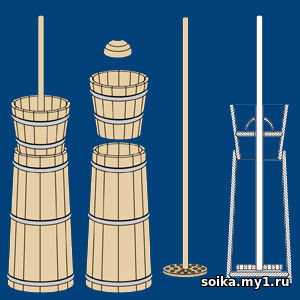Подойник - Все подойники имеют форму усечённого конуса. У одних предполагаемая вершина обращена вверх, а у других – вниз. Соответственно этому верх подойника сужается или расширяется. Подойник с расширяющимся верхом отличается от обычного бондарного ведра лишь двумя специальными клёпками.