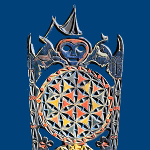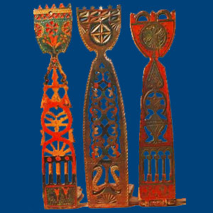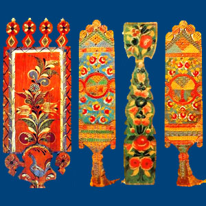 Грязовецкие прялки иногда по резьбе покрывались росписью масляными красками. Это была или многоцветная раскраска, или очень часто кистевая роспись цветочного рисунка.