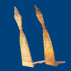 Форму прялки диктует тупой угол, под которым корень расположен к стволу. Поэтому ножка с лопаской, которую режут из ствола берёзы, стоит не под прямым углом к донцу, на которое шёл корень, а как бы чуть наклоняясь вперёд. Это придаёт особенное изящество, грациозность предмету и делает его очень удобным для работы. Основной узор выполнен на лицевой стороне контурной резьбой, которая исполнялась очень тонким резцом. А кроме контура всех изображений, присутствует «скобчатая» резьба, которая густо заполняет плоскость каждого контурного рисунка мелким, дробным узором. И «контурная», и «скобчатая» резьба не нарушает гладь дерева, его плоскость, она врезалась в глубину тонкими штрихами как гравюра. Композицию прялки венчает нарядный терем-башня с ажурной резьбой. На лопаске двуглавый орёл, в верхней части ножки прорисован шпиль храма с колокольней, далее — часы-розетка с циферблатом римскими цифрами и надписью «ПИ». На часах мастер вырезал дату г.; слева и справа от часов цветы в горшках. Часы украшали Петропавловскую церковь, построенную на территории Б. Ярославской мануфактуры в – гг. именно к их облику тяготеет изображение терема на многих прялках Даниловского уезда Ярославской губернии. На нижней части ножки теремковой прялки вырезаны две жанровые композиции, помещенные одна над другой, по-видимому, они связаны между собой общим сюжетом. | |