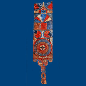 Конструкция: прялка состоит из прямоугольной массивной лопасти, прямой укороченной ножки с кубическим утолщением и донца. Лопаска вырезалась из ствола дерева, а донце — из корневища, расположенного перпендикулярно стволу. Ведущая роль отводится цветному фону — чаще всего красно-коричневому или зелёному, реже голубому и жёлтому. Мастера работали крупными сочными мазками с применением только белильных «оживок». Ветки, стебли и листья играют второстепенную роль, объединяя мотивы росписи в букеты и цветущие ветви. Обычно они пишутся чёрным цветом, часто по красно-коричневому фону. Олонецкая роспись была распространена в верховьях Северной Двины (бассейны рек Кокшеньга, Устья, Вага) и на северо-западе — в бассейнах рек Онеги и Онежского озера. Среди многообразия крестьянских росписей Олонецкая занимает особое место. Она получила своё название по месту распространения в Олонецкой губернии, куда в конце –начале веков входит Каргопольский уезд и территория Кенозера. По стилю Олонецкая роспись относится к типу свободной кистевой росписи. Кистевые росписи, помимо общей техники, объединяет практически единственный мотив – различные варианты цветов, наносившихся масляными красками по масляному фону. Северные кистевые росписи хронологически относятся к XIII –XX началу веков. Однако характерные черты декоративного искусства этого времени уживаются в них со значительно более древними мотивами и художественными приемами. Так, например, изображение цветущего дерева встречается еще на бронзовых медалях, относящимся к X веку. Прялка, или как ее еще называют на севере, прясло, явление само по себе прелюбопытное. Здесь древние магические знаки плодородия и добра, призванные охранять владельца прялки от несчастий, сделать так, чтобы не переводилась в доме пряжа и была бы она крепкой – “доброй”. Прялка была очень важным предметом домашнего обихода старой северной деревни. Отличительной чертой олонецких прялок является соединение резьбы с раскраской и цветочной росписью. Живописные изображения отдельных цветов, кустов или веток на голубом, голубовато-зелёном и реже красном фонах помещаются на свободных от резьбы местах. Пышная роспись, исполненная приёмами свободных мазков, сочетается с многоцветной раскраской, разбивающей резную поверхность на цветовые поля. В некоторых местах прялки украшали только росписью. Расписывая прялки, мастера опирались и на местные традиции, и на свой профессиональный опыт маляра, живописца или каллиграфа-переписчика книг и миниатюриста. В отличие от резчиков, художники, которые расписывали прялки, проходили определённую выучку. Часто мастерство передавалось по наследству, и было основным занятием всей семьи в нескольких поколениях. Мотивы Олонецкой росписи связаны с миром природы-это деревья, вазоны,цветы,чаще красные розы и сказочные тюльпаны. В них выражалась любовь человека к природе и способность радоваться её красоте. О лете и солнце напоминали мотивы цветущих деревьев и вазонов, птиц и львов.
