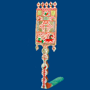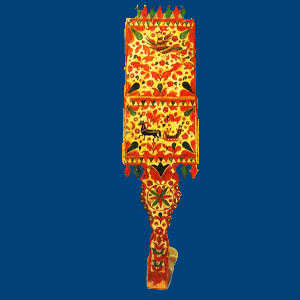 Фасадная сторона лопасти пермогорской прялки разделялась либо на два, либо на три «става». В двухставной схеме вверху обычно размешалась райская птица Сирин, обрамленная зубчатой розеткой, внизу – сиены чаепития либо катания. Обратная сторона лопасти оформлялась всегда одинаково: внизу – растительный узор, вверху – пустая орнаментальная рамка, которая закрывалась куделью. На трехставной лопасти вверху чаше всего изображались лев и единорог, в центре – супрядки, внизу – катание на конях. На обратной стороне – застолье. В колористической гамме пермогорской росписи преобладают красный и желтый цвета на белом (иногда желтоватом) фоне. Искусствоведы полагают, что основные элементы узора и цветовая гамма росписи Пермогорья имеют много общего с орнаментикой древнерусских рукописей поморской и особенно Белевской школ. Как уже указывалось, в пермогорской росписи господствовал образ Сирина. Изображения райской птицы можно было встретить не только на лопастях прялок, но и на многих других предметах крестьянского быта. Примечательно, что особенной популярностью сказочный образ птицы Сирин пользовался именно на Русском Севере: в знаменитой городецкой резьбе и живописи он практически не встречается. Это говорит о том, что якобы пришедший из Греции или с Востока образ таинственной и роковой птицедевы не просто пришелся по вкусу жителям Севера, а оказался для них знакомым и – вполне вероятно – даже родным. Скорее всего, здесь следует говорить об обшеиндоевропейских истоках этого древнейшего образа.