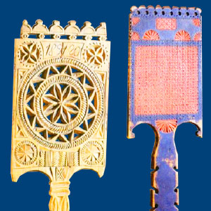 В центре композиции — солнечная розетка, обрамленная плотным геометрическим узором из треугольников и квадратов. Под городками обычно располагается решетка либо круглые сквозные отверстия в несколько рядов. Нижняя часть лопасти украшена двумя крупными сережками, обращенными к стояку. Прялки этого типа бытовали в районе Тотьмы, в Междуречье, на территории Биряковского и Чучковского сельсоветов Сокольского района, а также Погореловского, Великодворского и Верхне-Толшменского сельсоветов Тотемского района. Погореловские прялки миниатюрнее тотемских, сережки на нижней части их лопасти, как правило, не имеют круглого окончания, под городками нет прорезной решетки, но в целом они повторяют форму тотемских прялок. Биряковские прялки выделяются разреженностью геометрического узора. Их, как правило, не расписывали, а в более поздних вариантах красили под красное дерево, украшали накладными медными пластинками и инкрустировали кусочками зеркального стекла. Небольшие медные бляшки крепились на петельку и при каждом движении прялки издавали звон. Объяснялось это тем, что украшением местных прялок занималась семья мастеров-гармонщиков. Междуреченские прялки отличаются слегка суженой книзу формой лопасти, крупными округлыми городками, отсутствием сережек, а также изящной ножкой с фигурными краями. Трехгранно-выемчатая резьба на этих прялках дополнялась кистевой росписью, цветочные узоры которой напоминали ситец. На территории Великодворского сельсовета бытовали две разновидности прялок — с квадратной и вытянутой лопастью. К тотемскому типу следует отнести первую. Лопасть ее венчают — крупных ромбических городков, отделенных друг от друга глубокими круглыми вырезами. Две сережки на нижней части лопасти в точности повторяют форму городков. Ножка прялки слегка сужена кверху. Прялки Верхне-Толшменского сельсовета имеют оригинальное завершение лопасти тремя крупными городками в форме трилистника или круга. Большие сережки обычно повторяют форму городков. Ножка и лопасть прялки покрыты мелкой трехгранно-выемчатой резьбой. В центре композиции — солнечная розетка. Неподалеку от Толшмы на территории Совеги, ныне входящей в состав Солигаличского района Костромской области, бытовала еще одна оригинальная разновидность тотемской прялки с фигурной лопастью, городки и сережки которой выполнялись в форме крупных причудливых завитков, напоминающих стилизованные головки коней. Между городками возвышался пятилепестковый цветок. В центре композиции лопасти, украшенной трехгранно-выемчатой резьбой, обычно вырезалась розетка в квадрате. И, наконец, одной из позднейших разновидностей тотемской прялки являлась так называемая «Соломенка», ареал бытования которой был довольно обширен и охватывал территорию Верхне-Толшменского, Маныловского, Никольского и Великодворского сельсоветов. Основной отличительной особенностью этой разновидности прялок являлись зигзагообразные узоры, выложенные разноцветной соломкой. В центре лопасти — солнечная розетка, наверху ее — четыре городка в виде обращенных друг к другу рожек, внизу — прямо свисающие круглые сережки. Широкое распространение этих прялок обусловливалось тем, что их изготавливали на продажу кустарным способом. | |