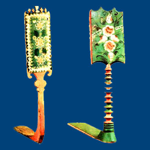 Справа, прялка составная, состоящая из вертикальной части, куда привязывается кудель, и горизонтальной (донце), где сидит пряха. Вертикальная часть состоит из лопаски (лопасть, лопати) и шейки (ножки). Прялку, особенно лопаску, часто украшали и расписывали. Лопасть данной прялки украшает урало-сибирская роспись, или по-другому ее еще называют «маховая» роспись. Это одна из разновидностей свободной кистевой росписи масляными красками на окрашенной деревянной основе, распространенная на Урале и в Западной Сибири. Достоверно неизвестно, кому принадлежит роспись на прялке. Можно предположить, что расписал заезжий «тюменский» или «кармацкий» красильщик. Кармацкие мастера жили в Тобольской губернии, сейчас эта местность относится к Свердловской области. Слева, прялка — корневая, то есть была сделана не на производстве, а в домашних условиях. | |