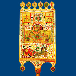 Нижняя Тойма. Под этим именем объединяется свыше десяти селений, расположенных у впадения речки Нижняя Тойма в Северную Двину. Различие между борецкими и нижнетоемскими прялками незначительны, в литературе можно увидеть атрибуцию одних и тех же прялок различным центрам. Это объясняется еще и тем, что мастера общались между собой и обменивались трафаретами. Нижняя Тойма, Борок и Пучуга - крупные поселения на Северной Двине. В настоящее время это Виноградовский (Борок) и Верхнетоемский (Нижняя Тойма и Пучуга) районы Архангельской области. Все три куста деревень расположены в нескольких километрах друг от друга. По форме прялки этого района одинаковы: верхушку украшали «бобочками» или «бобошками» (верхние круглые выступы; в других описаниях они могут встречаться под названиями: «городки», «маковки»), а низ головки – «сережками». Прялки этих трех кустов имеют фон ярко-белый, в росписи много золота, а орнамент мелкий и дробный. Нарядность и яркость росписи отличает их от прялок Пермогорья, более сдержанных и очень гармоничных по колориту. Композиция росписей этих северодвинских прялок конца XIX – начала ХХ в. определяется четким членением лопасти на три яруса (става). В верхней части лопасти помещались своеобразные окошки. Затем следует средний ярус с «древом», на поздних прялках древо превращается в цветущий куст с птицами на вершине и ветвях. В нижнем «ставе» часто изображалась поездка в санях, запряженных парой или одним конем. Особую нарядность росписи придает фон из сусального золота, который часто стали применять с конца XIX века. Золотили свои прялки и мастера Борка – члены знаменитой семьи Амосовых.