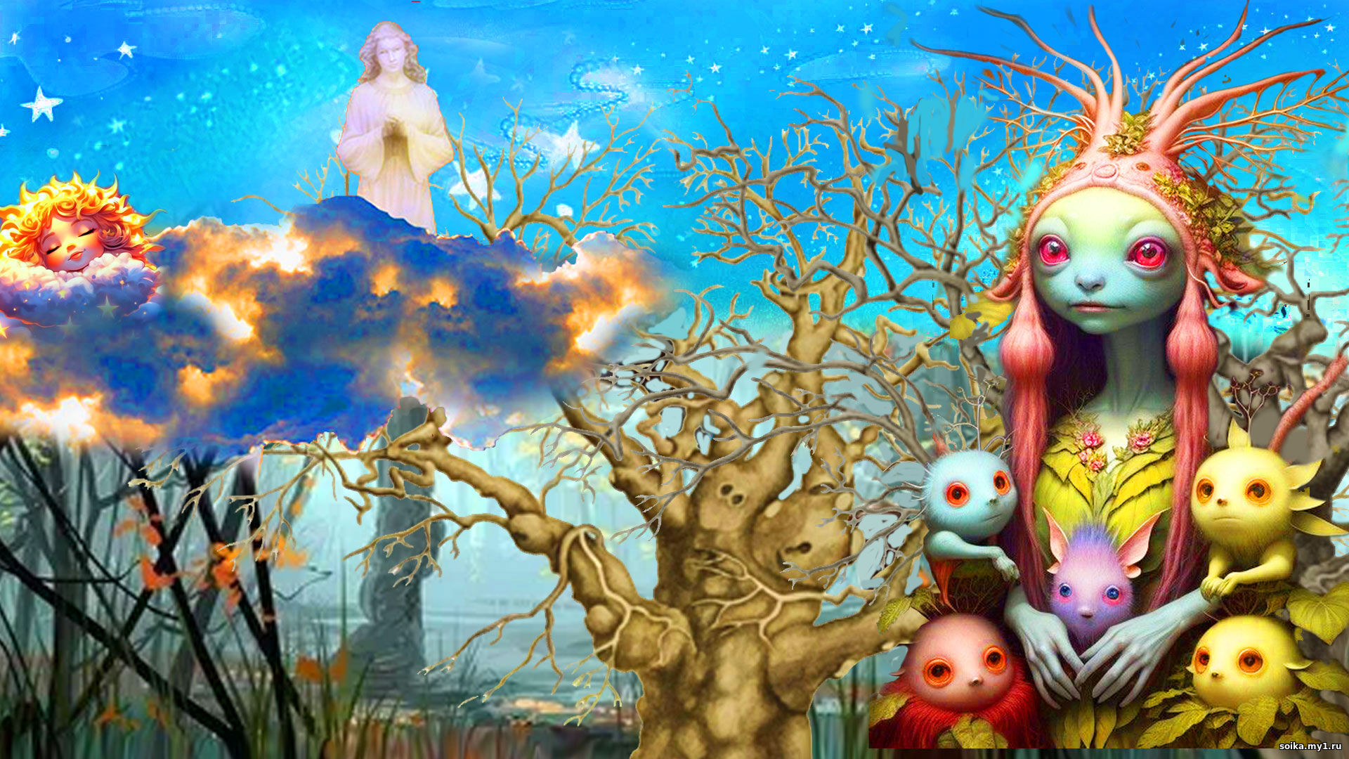 В последнее время Рассвет спит тревожно. Тревожно потому, что каждый раз, когда приходит время Рассвета, начинается такая непогода, что хоть весь день не покидай свое теплое лежбище. Но что поделать Рассвету, работа у него не то что по охоте, так ведь у него даже и выходных нет. Так уж распорядился САМ. САМ - это тот, кто управляет Жизнью. ОН давно уже САМ. Впрочем, почему, давно? ОН всегда был. И всегда САМ. ОН установил порядок следования Света и Тьмы. И между ними поставил Сумерки. И все подчиняются этому расписанию. Так надо. И все это знают. И никто не возмущается. Не возмущается и Рассвет. А чего возмущаться? Кто его заменит? Да и не разбрасываются умные такими должностями. Неудобства приходят и уходят, а Жизнь течет своим чередом. Рассвет потянулся - потянулся: Солнце требовательно заглядывало в его глаза. Да. Надо вставать, как бы ни было жалко вылезать из теплой лежанки. Рассвет поднялся, поприветствовал Солнце: - О, Великое Солнце! Да будет сиять Свет Твой вечно! И достигнут Лучи Твои Дальнюю Даль! Солнце снисходительной улыбкой ответило Рассвету и предупреждающе напомнило: - Рассвет, ты не затягивай свое присутствие над Землею. Ныне твое время коротко. САМ готовит Землю ко сну. Рассвет утвердительно кивнул головой: - Да, понимаю. Видно это и по тем Тучам, что застлали весь вид на Землю. Само - то Ты, как? Пробило своими Лучами хоть малое пространство к Земле? Солнце разочарованно сказало: - Нет. САМ не велел. Сказал: "Пора Земле на покой. Полгода спать ей". Но Рассвет, наша работа есть всегда. Как бы не распорядился САМ, мы - всегда готовы принять его Волю. - Да, Солнце, я - в курсе. Но Ты хотя бы немного согрей мне правый бок. Поостыл я от Северного Ветра. - Хорошо, Рассвет, повернись ко мне правым боком. Мне - то, негоже вертеться по Небу, ты это ведь понимаешь. Рассвет повернулся к Солнцу правым боком, прогрелся, и совершенно бодрым встал длинными ногами на Тучи, что плыли по воле Ветра над Землею. Тучи привычно и с удовольствием принимали Рассвет на свои бока, ибо они становились много красивее, от того, что на них наступал Рассвет. Они видели, как Люди поднимали свои головы и любовались Тучами, сияющими в лучах Рассвета. Такие взгляды очень нравились Тучам. От таких взглядов, Тучи обычно начинали прихорашиваться, клубиться, и соображать из себя различные фигуры. Особенно Тучам нравилось, если фигура походила на одно из существ Земли. Тогда они своими мохнатыми ушами слушали с удовольствием, как люди кричат: - Смотри! вон та туча на лошадь похожа! - А ты посмотри вон на ту: точно - сокол летит! Ишь, как крылья размахнула, вот те и туча... А Тучи соревновались: кто причудливее сообразит фигуру, и старались, покуда Ветер не угонял их от глаз Людских. Рассвет по Тучам опустился на Кроны Деревьев, и Деревья в почти полусне, шевельнули ветвями: - О... это Рассвет... Как темно без тебя, Рассвет. Где же ты затерялся? Смотри, наша Листва желтеет без Тебя. Мы роняем свою Красоту. Наши постоянные квартиранты - Птицы - покидают нас. А нам так приятно их пение... Рассвет, не уходи от нас - Нет, Деревья, не я решаю когда мне прийти, когда уйти. То решает САМ. А САМ решил, что отзеленели вы свое время, позабавились своей красотой и насладились пением Птиц. Пришла пора отдыха. Спать вам полгода теперь. Деревья зашелестели оставшейся пожухлой листвой: - Не хотим, не хотим спать... - Не возмущайте