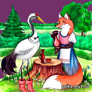 Вот и вздумала однажды лиса угостить журавля, пошла звать его к себе в гости: «Приходи, куманек, приходи, дорогой! Уж я как тебя угощу!» Идет журавль на званый пир, а лиса наварила манной каши и размазала по тарелке. Подала и потчевает: «Покушай, мой голубчик-куманек! Сама стряпала». Журавль хлоп-хлоп носом, стучал, стучал, ничего не попадает! А лисица в это время лижет себе да лижет кашу, так всю сама и скушала. Каша съедена; лисица говорит: «Не бессудь, любезный кум! Больше потчевать нечем». «Спасибо, кума, и на этом! Приходи ко мне в гости». На другой день приходит лиса, а журавль приготовил окрошку, наклал в кувшин с малым горлышком, поставил на стол и говорит: «Кушай, кумушка! Право, больше нечем потчевать». Лиса начала вертеться вокруг кувшина, и так зайдет и этак, и лизнет его, и понюхает-то, все ничего не достанет! Не лезет голова в кувшин. А журавль меж тем клюет себе да клюет, пока все поел. «Ну, не бессудь, кума! Больше угощать нечем». Взяла лису досада, думала, что наестся на целую неделю, а домой пошла как несолоно хлебала. Как аукнулось, так и откликнулось! С тех пор и дружба у лисы с журавлем врозь.