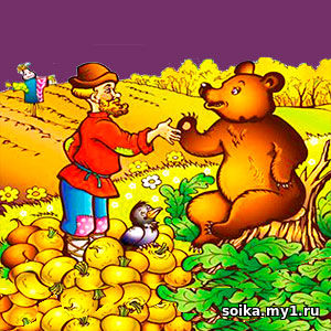 – Не ломай меня, медведюшка, лучше давай вместе репу сеять. Я себе возьму хоть корешки, а тебе отдам вершки. – Быть так, – сказал медведь. – А коли обманешь, так в лес ко мне хоть не езди. Сказал и ушел в дуброву. Репа выросла крупная. Мужик приехал осенью копать репу. А медведь из дубровы вылезает: – Мужик, давай репу делить, мою долю подавай. – Ладно, медведюшка, давай делить: тебе вершки, мне корешки. Отдал мужик медведю всю ботву, а репу наклал на воз и повез в город продавать. Навстречу ему медведь: – Мужик, куда ты едешь? – Еду, медведюшка, в город корешки продавать. – Дай-ка попробовать – каков корешок? Мужик дал ему репу. Медведь как съел: – А-а! – заревел. – Мужик, обманул ты меня! Твои корешки сладеньки. Теперь не езжай ко мне в лес по дрова, а то заломаю. На другой год мужик посеял на том месте рожь. Приехал жать, а уж медведь его дожидает: – Теперь меня, мужик, не обманешь, давай мою долю. Мужик говорит: – Быть так. Бери, медведюшка, корешки, а я себе возьму хоть вершки. Собрали они рожь. Отдал мужик медведю корешки, а рожь наклал на воз и увез домой. Медведь бился, бился, ничего с корешками сделать не мог. Рассердился он на мужика, и с тех пор у медведя с мужиком вражда пошла. Автор: Толстой Алексей Николаевич