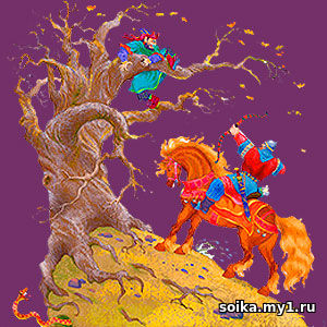Так дошел Илья до речки Смородиной. Течет река широкая, бурливая, с камня на камень перекатывается. Заржал конь Бурушка, взвился выше темного леса и одним скачком перепрыгнул реку. А за рекой сидит Соловей-разбойник на трех дубах, на девяти суках. Мимо тех дубов ни сокол не пролетит, ни зверь не пробежит, ни змей не проползет. Все боятся Соловья-разбойника, никому умирать не хочется... Услыхал Соловей конский скок, привстал на дубах, закричал страшным голосом: - Что это за невежа проезжает тут, мимо моих заповедных дубов? Спать не дает Соловью-разбойнику! Да как засвищет он по-соловьиному, зарычит по-звериному, зашипит по-змеиному, так вся земля дрогнула, столетние дубы покачнулись, цветы осыпались, трава полегла. Бурушка-Косматушка на колени упал. А Илья в седле сидит, не шевельнется, русые кудри на голове не дрогнут. Взял он плетку шелковую, ударил коня по крутым бокам. - Травяной ты мешок, не богатырский конь. Не слыхал ты разве писка птичьего, шипения гадючьего. Вставай на ноги, подвези меня ближе к Соловьиному гнезду, не то волкам тебя брошу на съедение. Тут вскочил Бурушка на ноги, подскакал к Соловьиному гнезду. Удивился Соловей-разбойник – Это что такое? Из гнезда высунулся. А Илья, ни минуточки не мешкая, натянул тугой лук, спустил каленую стрелу, небольшую стрелу, весом в целый пуд. Взвыла тетива, полетела стрела, угодила Соловью в правый глаз, вылетела через левое ухо. Покатился Соловей из гнезда, словно овсяной сноп. Подхватил его Илья на руки, связал крепко ремнями сыромятными, подвязал к левому стремени. Глядит Соловей на Илью, слово вымолвить боится. - Что глядишь на меня, разбойник, или русских богатырей не видывал? - Ох, попал я в крепкие руки, видно не бывать мне больше на волюшке! Поскакал Илья дальше по прямой дороге и прискакал на подворье Соловья-разбойника. У него двор на семи верстах, на семи столбах, у него вокруг железный тын, на каждой тычинке по маковке, на каждой маковке голова богатыря убитого. А на дворе стоят палаты белокаменные, как жар горят крылечки золоченые. Увидала дочка Соловья богатырского коня, закричала на весь двор: - Едет, едет наш батюшка Соловей Рахманович, везет у стремени мужичишку-деревенщину. Выглянула в окно жена Соловья-разбойника, руками всплеснула: - Что ты говоришь, неразумная! Это едет мужик-деревенщина и у стремени везет нашего батюшку - Соловья Рахмановича! Выбежала старшая дочка Соловья - Пелька - во двор, ухватила доску железную, весом в девяносто пудов и метнула ее в Илью Муромца. Но Илья ловок да увертлив был, отмахнулся он от доски богатырской рукой, полетела доска обратно, попала в Пельку и убила ее до смерти. Бросилась жена Соловья Илье в ноги: - Ты возьми у нас, богатырь, серебра, золота, бесценного жемчуга, сколько может увезти твой богатырский конь, отпусти только нашего батюшку, Соловья-разбойника. Говорит ей Илья в ответ: - Мне подарков неправедных не надобно. Они добыты слезами детскими, они политы кровью русскою, нажиты нуждой крестьянскою. Как в руках разбойник - он всегда тебе друг, а отпустишь - снова с ним наплачешься. Я свезу Соловья в Киев-город, там на квас пропью, на калачи проем. Повернул Илья коня и поскакал к Киеву. Приумолк Соловей, не шелохнется. Едет Илья по Киеву, подъезжает к палатам княжеским. Привязал он коня к столбику точеному, оставил на нем Соловья-разбойника, а сам пошел в 