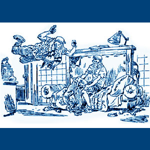 Этот звон вливается в последние сны то судорожным стрекотанием итогового перфоратора, то гневными раскатами баса Фёдора Симеоновича, то скрежетом когтей василиска, играющего в термостате. В то утро мне снился Модест Матвеевич Камноедов. Будто он стал заведующим вычислительным центром и учит меня работать на «Алдане». «Модест Матвеевич, — говорил я ему, — ведь всё, что вы мне советуете, это какой-то болезненный бред». А он орал: «Вы мне это пр-р-рекратите! У вас тут всё др-р-ребедень! Бели-бер-р-рда!» Тогда я сообразил, что это не Модест Матвеевич, а мой будильник «Дружба» на одиннадцати камнях, с изображением слоника с поднятым хоботом, забормотал: «Слышу, слышу», — и забил ладонью по столу вокруг будильника. Окно было раскрыто настежь, и я увидел ярко-синее весеннее небо и почувствовал острый весенний холодок. По карнизу, постукивая, бродили голуби. Вокруг стеклянного плафона под потолком обессиленно мотались три мухи — должно быть, первые мухи в этом году. Время от времени они вдруг принимались остервенело кидаться из стороны в сторону, и спросонок мне пришла в голову гениальная идея, что мухи, наверное, стараются выскочить из плоскости, через них проходящей, и я посочувствовал этому безнадёжному занятию. Две мухи сели на плафон, а третья исчезла, и тогда я окончательно проснулся. Прежде всего я отбросил одеяло и попытался воспарить над кроватью. Как всегда, без зарядки, без душа и завтрака это привело лишь к тому, что реактивный момент с силой вдавил меня в диван-кровать и где-то подо мной соскочили и жалобно задребезжали пружины. Потом я вспомнил вчерашний вечер, и мне стало очень обидно, потому что сегодня я весь день буду без работы. Вчера в одиннадцать часов вечера в электронный зал пришёл Кристобаль Хозевич и, как всегда, подсоединился к «Алдану», чтобы вместе с ним разрешить очередную проблему смысла жизни, и через пять минут «Алдан» загорелся. Не знаю, что там могло гореть, но «Алдан» вышел из строя надолго, и поэтому я, вместо того чтобы работать, должен буду, подобно всем волосатоухим тунеядцам, бесцельно бродить из отдела в отдел, жаловаться на судьбу и рассказывать анекдоты. Я сморщился, сел на постели и для начала набрал полную грудь праны, смешанной с холодным утренним воздухом. Некоторое время я ждал, пока прана усвоится, и в соответствии с рекомендацией думал о светлом и радостном. Затем я выдохнул холодный утренний воздух и принялся выполнять комплекс упражнений утренней гимнастики. Мне рассказывали, что старая школа предписывала гимнастику йогов, но йога-комплекс, так же как и почти ныне забытый майя-комплекс, отнимал пятнадцать-двадцать часов в сутки, и с назначением на пост нового Президента АН СССР старой школе пришлось уступить. Молодёжь НИИЧАВО с удовольствием ломала старые традиции. На сто пятнадцатом прыжке в комнату впорхнул мой сожитель Витька Корнеев. Как всегда с утра, он был бодр, энергичен и даже благодушен. Он хлестнул меня по голой спине мокрым полотенцем и принялся летать по комнате, делая руками и ногами движения, как будто плывёт брассом. При этом он рассказывал свои сны и тут же толковал их по Фрейду, Мерлину и по девице Ленорман. Я сходил умылся, мы прибрались и отправились в столовую. В столовой мы заняли свой любимый столик под большим, уже выцветшим плакатом: «Смелее, товарищи! Щёлкайте челюстями! 