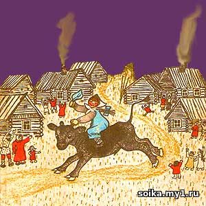 — Отпустите с нами Нюрочку-девчурочку в лес – по грибы, по ягоды! Мать да отец говорят: — Ступайте, только не потеряйте её в лесу: она у нас маленькая – заблудится, одна дороги домой не найдёт. — Мы её не потеряем! Вот подружки и пошли все в лес. Стали в лесу собирать грибы да ягоды и разбрелись в разные стороны. Разбрелись да и потеряли Нюрочку-девчурочку. Осталась она в лесу одна-одинёшенька и стала плакать. А в это время шла мимо Баба Яга, костяная нога. Увидела она Нюрочку-девчурочку, схватила её и потащила в свою избушку на курьих ножках. Притащила и говорит: — Будешь теперь на меня работать! Печку топи, дрова руби, воду носи, пряжу пряди, избу мети! Стала Нюрочка-девчурочка жить у Бабы Яги. Баба Яга с утра до ночи работать её заставляла, досыта не кормила, ругала-бранила. Вот раз Баба Яга ушла из избушки, а Нюрочка-девчурочка сидит у окошка, пряжу прядёт, а сама горько плачет. Бегут мимо овцы: — Бе-бе-бе! О чём девочка так горько плачешь? — Как же мне, как же мне овечки не плакать! Меня Баба Яга домой не пускает, досыта не кормит, бранит-ругает, целый день работать заставляет. Баран говорит: — Садись на меня, я тебя домой увезу! Села Нюрочка-девчурочка на барана – он и побежал, а овечки за ним. Вернулась Баба Яга в избушку, хватилась – нету Нюрочки-девчурочки! Села она в ступу, пустилась в погоню. Пестом погоняет, помелом след заметает. Догнала барана, отняла Нюрочку-девчурочку, притащила назад в свою избушку на курьих ножках. Опять заставила её работать с утра до ночи, опять стала ругать-бранить. Сидит раз Нюрочка-девчурочка на крыльце, прядёт пряжу да плачет. Бегут мимо козы: — Ме-ме-ме! О чём, девочка, плачешь? — Как же мне козочки не плакать! Меня Баба Яга домой не пускает, бранит-ругает. Козёл говорит: — Садись на меня, я тебя увезу от Бабы Яги! Села Нюрочка-девчурочка на козла, он и побежал. Да не очень быстро бежал: Баба Яга его догнала, Нюрочку-девчурочку отняла и опять притащила в избушку. Как Баба Яга ушла, Нюрочка-девчурочка вышла на крылечко, села на ступеньки, сидит горюет. Идёт мимо стадо коров да телят, а позади всех бычок – чёрный бочок, белые копытца. Спрашивает он Нюрочку-девчурочку: — Му-му-му! О чём горюешь? — Как же мне, бычок – чёрный бочок, не горевать! Меня Баба Яга к себе утащила, домой не отпускает, бранит-ругает, без отдыха работать заставляет. — Садись на меня, я тебя домой увезу! — Где тебе, бычок – чёрный бочок! Меня баран увозил – не увёз, козёл увозил – не увёз, а ты и вовсе не увезёшь: не умеешь быстро бегать. — Баран не увёз, козёл не увёз, а я увезу, только держись крепче за мои рожки! Вот Нюрочка-девчурочка уселась на бычка и ухватилась за его рожки! Бычок – чёрный бочок, белые копытца головой тряхнул, хвостиком махнул и побежал. А Баба Яга хватилась – Нюрочки-девчурочки опять нет! Села Баба Яга в ступу, пестом погоняет, сама покрикивает: — Сейчас догоню! Сейчас схвачу! Домой притащу, никогда не отпущу! Подлетела – того гляди, схватит. А бычок — чёрный бочок скорее к грязному болотцу. Только Баба Яга подлетела да из ступы выскочила, бычок и стал по болотцу задними ногами бить: забрызгал Бабу Ягу с ног до головы грязью, все глаза ей залепил. Пока Баба Яга глаза протирала да брови прочищала, бычок – чёрный бочок прибежал в деревню, постучал рожками в окошко и кричит: — Му-му! Выходите скорее: я вашу Нюрочку-девчурочку от Бабы Яги привёз! Вы