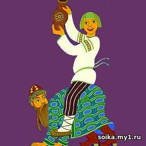 – Мир по дороге! Горшеня оглянулся: – Благодарим, просим со смиреньем. – Знать, вздремал? – Вздремал, великий государь! Не бойся того, кто песни поет, а бойся того, кто дремлет. – Экой ты смелый, горшеня! Люблю эдаких. Ямщик! Поезжай тише. А что, горшенюшка, давно ты этим ремеслом кормишься? – Сызмолоду, да вот и середовой стал. – Кормишь детей? – Кормлю, ваше царское величество! И не пашу, и не кошу, и не жну, и морозом не бьет. – Хорошо, горшеня, но все-таки на свете не без худа. – Да, ваше царское величество! На свете есть три худа. – А какие три худа, горшенюшка? – Первое худо – худой шабер, а второе худо – худая жена, а третье худо – худой разум. – А скажи мне, которое худо всех хуже? – От худого шабра уйду, от худой жены тоже можно, как будет с детьми жить; а от худого разума не уйдешь – все с тобой. – Так, верно, горшеня! Ты мозголов. Слушай! Ты для меня, а я для тебя. Прилетят гуси с Руси, перышки ощиплешь, а по правильному покинешь! – Годится, так покину, как придет! А то и наголо. – Ну, горшеня, постой на час! Я погляжу твою посуду. Горшеня остановился, начал раскладывать товар. Государь стал глядеть, и показались ему три тарелочки глиняны. – Ты наделаешь мне эдаких? – Сколько угодно вашему царскому величеству? – Возов десяток надо. – Много ли дашь времени? – Месяц. – Можно и в две недели представить, и в город. Я для тебя, ты для меня. – Спасибо, горшенюшка! – А ты, государь, где будешь в то время, как я представлю товар в город? – Буду в дому у купца в гостях. Государь приехал в город и приказал, чтобы на всех угощениях не было посуды ни серебряной, ни оловянной, ни медной, ни деревянной, а была бы все глиняная. Горшеня кончил заказ царский и привез товар в город. Один боярин выехал на торжище к горшене и говорит ему: – Бог за товаром, горшеня! – Просим покорно. – Продай мне весь товар. – Нельзя, по заказу. – А что тебе, ты бери деньги – не повинят из этого, коли не дал задатку под работу. Ну, что возьмешь? – А вот что: каждую посудину насыпать полну денег. – Полно, горшенюшка, много! – Ну хорошо: одну насыпать, а две отдать – хочешь? И сладили. – Ты для меня, а я для тебя. Насыпают да высыпают. Сыпали, сыпали – денег не стало, а товару еще много. Боярин, видя худо, съездил домой, привез еще денег. Опять сыплют да сыплют – товару все много. – Как быть, горшенюшка? – Ну что? Нечего делать, я тебя уважу, только знаешь что? Свези меня на себе до этого двора – отдам и товар и все деньги. Боярин мялся, мялся: жаль и денег, жаль и себя; но делать нечего – сладили. Выпрягли лошадь, сел мужик, повез боярин: в споре дело. Горшеня запел песню, боярин везет да везет. – До коих же мест везти тебя? – Вот до этого двора и до этого дому. Весело поет горшеня, против дому он высоко поднял. Государь услышал, выбег на крыльцо – признал горшеню. – Ба! Здравствуй, горшенюшка, с приездом! – Благодарю, ваше царское величество. – Да на чем ты едешь? – На худом-то разуме, государь. – Ну, мозголов, горшеня, умел товар продать. Боярин, скидай строевую одежду и сапоги, а ты, горшеня, – кафтан и разувай лапти; ты их обувай, боярин, а ты, горшеня, надевай строевую одежду. Умел товар продать! Немного послужил, да много услужил. А ты не умел владеть боярством. Ну, горшеня, прилетали гуси с Руси? – Прилетали. – Перышки ощипал, а по правильному покинул? – Нет, наголо, великий государь, – всего ощипал. | |