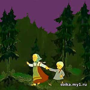 — Доченька, — говорила мать, — мы пойдем на работу, береги братца. Не ходи со двора, будь умницей — мы купим тебе платочек. Отец с матерью ушли, а дочка позабыла, что ей приказывали: посадила братца на травке под окошко, а сама побежала на улицу гулять. Налетели гуси-лебеди, подхватили мальчика, унесли на крыльях. Вернулась девочка, смотрит — а братца нету! Ахнула, кинулась его искать, туда-сюда — нет нигде! Она его кликала, слезами заливалась, причитывала, что худо будет от отца с матерью, — братец не откликнулся. Выбежала она в чистое поле и только видела: метнулись вдалеке гуси-лебеди и пропали за темным лесом. Тут она догадалась, что они унесли ее братца: про гусей-лебедей давно шла дурная слава о том что, они маленьких детей уносили. Бросилась девочка догонять их. Бежала, бежала, увидела — стоит печь. — Печка, печка, скажи, куда гуси-лебеди полетели? Печка ей отвечает: — Съешь моего ржаного пирожка — скажу. — Стану я ржаной пирог есть! У моего батюшки и пшеничные не едятся… Печка ей не сказала. Побежала девочка дальше — стоит яблоня. — Яблоня, яблоня, скажи, куда гуси-лебеди полетели? — Поешь моего лесного яблочка — скажу. — У моего батюшки и садовые не едятся… Яблоня ей не сказала. Побежала девочка дальше. Течет молочная река в кисельных берегах. — Молочная река, кисельные берега, куда гуси-лебеди полетели? — Поешь моего простого киселька с молочком — скажу. — У моего батюшки и сливочки не едятся… Долго она бегала по полям, по лесам. День клонился к вечеру, делать нечего — надо идти домой. Вдруг видит — стоит избушка на курьей ножке, с одним окошком, кругом себя поворачивается. В избушке старая баба-яга прядет кудель. А на лавочке сидит братец, играет серебряными яблочками. Девочка вошла в избушку: — Здравствуй, бабушка! — Здравствуй, девица! Зачем на глаза явилась? — Я по мхам, по болотам ходила, платье измочила, пришла погреться. — Садись покуда кудель прясть. Баба-яга дала ей веретено, а сама ушла. Девочка прядет — вдруг из-под печки выбегает мышка и говорит ей: — Девица, девица, дай мне кашки, я тебе добренькое скажу. Девочка дала ей кашки, мышка ей сказала: — Баба-яга пошла баню топить. Она тебя вымоет выпарит, в печь посадит, зажарит и съест, сама на твоих костях покатается. Девочка сидит ни жива ни мертва, плачет, а мышка ей опять: — Не дожидайся, бери братца, беги, а я за тебя кудель попряду. Девочка взяла братца и побежала. А баба-яга подойдет к окошку и спрашивает: — Девица, прядешь ли? Мышка ей отвечает: — Пряду, бабушка… Баба-яга баню вытопила и пошла за девочкой. А в избушке нет никого. Баба-яга закричала: — Гуси-лебеди! Летите в погоню! Сестра братца унесла!.. Сестра с братцем добежала до молочной реки. Видит — летят гуси-лебеди. — Речка, матушка, спрячь меня! — Поешь моего простого киселька. Девочка поела и спасибо сказала. Река укрыла ее под кисельным бережком. Гуси-лебеди не увидали, пролетели мимо. Девочка с братцем опять побежали. А гуси-лебеди воротились навстречу, вот-вот увидят. Что делать? Беда! Стоит яблоня… — Яблоня, матушка, спрячь меня! — Поешь моего лесного яблочка. Девочка поскорее съела и спасибо сказала. Яблоня ее заслонила ветвями, прикрыла листами. Гуси-лебеди не увидали, пролетели мимо. Девочка опять побежала. Бежит, бежит, уж недалеко осталось. Тут гуси-лебеди увидали ее, загоготали — налетают, крыльями бьют, того гляди, б