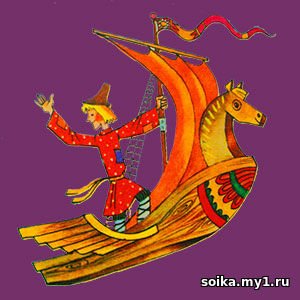— Ему, дурачку, все равно: он ничего не смыслит, ничего не понимает! Вот однажды дошла до той деревни весть: кто построит царю такой корабль, чтоб и по морям ходил и под облаками летал, — за того царь свою дочку выдаст. Решили старшие братья счастья попытать. — Отпустите нас, батюшка и матушка! Авось который-нибудь из нас царским зятем станет! Снарядила мать старших сыновей, напекла им в дорогу пирогов белых, нажарила-наварила курятины да гусятины: — Ступайте, сыночки! Отправились братья в лес, стали деревья рубить да пилить. Много нарубили-напилили. А что дальше делать — не знают. Стали они спорить да браниться, того и гляди, друг дружке в волосы вцепятся. Подошел тут к ним старичок и спрашивает: — Из-за чего у вас, молодцы, спор да брань? Может, и я вам какое слово на пользу скажу? Накинулись оба брата на старичка — слушать его не стали, нехорошими словами обругали и прочь прогнали. Ушел старичок. Поругались еще братья, съели все свои припасы, что им мать дала, и возвратились домой ни с чем... Как пришли они, начал проситься младший: — Отпустите теперь меня! Стали мать и отец отговаривать его да удерживать: — Куда тебе, дурню, — тебя волки по дороге съедят! А дурень знай свое твердит: — Отпустите — пойду, и не отпустите — пойду! Видят мать и отец — никак с ним не сладишь. Дали ему на дорогу краюху черного сухого хлеба и выпроводили вон из дому. Взял дурень с собой топор и отправился в лес. Ходил-ходил по лесу и высмотрел высокую сосну: верхушкой в облака эта сосна упирается, обхватить ее впору только троим. Срубил он сосну, стал ее от сучьев очищать. Подошел к нему старичок. — Здравствуй, — говорит, — дитятко! — Здравствуй, дедушка! — Что это, дитятко, ты делаешь, на что такое большое дерево срубил? — А вот, дедушка, царь обещал выдать свою дочку за того, кто ему летучий корабль построит, я и строю. — А разве ты сможешь такой корабль смастерить? Это дело мудреное, пожалуй, и не сладишь. — Мудреное не мудреное, а попытаться надо: глядишь, и слажу! Вот и ты, кстати, пришел: старые люди бывалые, сведущие. Может, ты мне, что и присоветуешь. Старичок говорит: — Ну, коли просишь совет тебе подать, слушай: возьми-ка ты свой топор и отеши эту сосну с боков: вот этак! И показал, как надо обтесывать. Послушался дурень старичка — обтесал сосну так, как он показывал. Обтесывает он, диву дается: топор так сам и ходит, так и ходит! — Теперь, — говорит старичок, — обделывай сосну с концов: вот так и вот этак! Дурень старичковы слова мимо ушей не пропускает: как старичок показывает, так он и делает. Закончил он работу, старичок похвалил его и говорит: — Ну, теперь не грех передохнуть да закусить малость. — Эх, дедушка, — говорит дурень, — для меня-то еда найдется, вот эта краюха черствая. А тебя-то чем угостить? Ты небось и не угрызешь мое угощение? — А ну-ка, дитятко, — говорит старичок, — дай сюда свою краюху! Дурень подал ему краюху. Старичок взял ее в руки, осмотрел, пощупал да и говорит: — Не такая уж черствая твоя краюха! И подал ее дурню. Взял дурень краюху — глазам своим не верит: превратилась краюха в мягкий да белый каравай. Как поели они, старик и говорит: — Ну, теперь станем паруса прилаживать! И достал из-за пазухи кусок холста. Старичок показывает, дурень старается, на совесть все делает — и паруса готовы, прилажены. — Садись теперь в свой корабль, — говорит старичок, — и лети, к