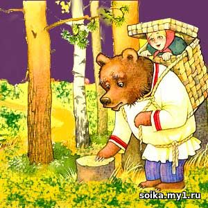 Собрались раз подружки в лес по грибы да по ягоды. Пришли звать с собой и Машеньку. — Дедушка, бабушка, — говорит Машенька, — отпустите меня в лес с подружками! Дедушка с бабушкой отвечают: — Иди, только смотри от подружек не отставай, не то заблудишься. Пришли девушки в лес, стали собирать грибы да ягоды. Вот Машенька — деревце за деревце, кустик за кустик — и ушла далеко-далеко от подружек. Стала она аукаться, стала их звать, а подружки не слышат, не отзываются. Ходила, ходила Машенька по лесу — совсем заблудилась. Пришла она в саму глушь, в саму чащу. Видит — стоит избушка. Постучала Машенька в дверь — не отвечают. Толкнула она дверь — дверь и открылась. Вошла Машенька в избушку, села у окна на лавочку. Села и думает: «Кто же здесь живет? Почему никого не видно?..» А в той избушке жил большущий медведь. Только его тогда дома не было: он по лесу ходил. Вернулся вечером медведь, увидел Машеньку, обрадовался. — Ага, — говорит, — теперь не отпущу тебя! Будешь у меня жить. Будешь печку топить, будешь кашу варить, меня кашей кормить. Потужила Маша, погоревала, да ничего не поделаешь. Стала она жить у медведя в избушке. Медведь на целый день уйдет в лес, а Машеньке наказывает никуда без него из избушки не выходить. — А если уйдешь, — говорит, — все равно поймаю и тогда уж съем! Стала Машенька думать, как ей от медведя убежать. Кругом лес, в какую сторону идти — не знает, спросить не у кого… Думала она, думала и придумала. Приходит раз медведь из лесу, а Машенька и говорит ему: — Медведь, медведь, отпусти меня на денек в деревню: я бабушке да дедушке гостинцев снесу. — Нет, — говорит медведь, — ты в лесу заблудишься. Давай гостинцы, я их сам отнесу. А Машеньке того и надо! Напекла она пирожков, достала большой-пребольшой короб и говорит медведю: — Вот, смотри: я в этот короб положу пирожки, а ты отнеси их дедушке да бабушке. Да помни: короб по дороге не открывай, пирожки не вынимай. Я на дубок влезу, за тобой следить буду! — Ладно, — отвечает медведь, — давай короб! Машенька говорит: — Выйди на крылечко, посмотри, не идет ли дождик! Только медведь вышел на крылечко, Машенька сейчас же залезла в короб, а на голову себе блюдо с пирожками поставила. Вернулся медведь, видит — короб готов. Взвалил его на спину и пошел в деревню. Идет медведь между елками, бредет медведь между березками, в овражки спускается, на пригорки поднимается. Шел-шел, устал и говорит: — Сяду на пенек, Съем пирожок! А Машенька из короба: — Вижу, вижу! Не садись на пенек, Не ешь пирожок! Неси бабушке, Неси дедушке! — Ишь какая глазастая, — говорит медведь, — все видит! Поднял он короб и пошел дальше. Шел-шел, шел-шел, остановился, сел и говорит: — Сяду на пенек, Съем пирожок! А Машенька из короба опять: — Вижу, вижу! Не садись на пенек, Не ешь пирожок! Неси бабушке, Неси дедушке! Удивился медведь: — Вот какая хитрая! Высоко сидит, далеко глядит! Встал и пошел скорее. Пришел в деревню, нашел дом, где дедушка с бабушкой жили, и давай изо всех сил стучать в ворота: — Тук-тук-тук! Отпирайте, открывайте! Я вам от Машеньки гостинцев принес. А собаки почуяли медведя и бросились на него. Со всех дворов бегут, лают. Испугался медведь, поставил короб у ворот и пустился в лес без оглядки. Вышли тут дедушка да бабушка к воротам. Видят — короб стоит. — Что это в коробе? — говорит бабушка. А дедушка поднял крышку, смотрит — и глазам сво