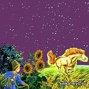 Приходит первая ночь. Отправился старший сын пшеницу стеречь, да захотелось ему спать: забрался он на сеновал и проспал до утра. Приходит домой и говорит: — Всю ночь не спал, иззяб, а вора не видал. На вторую ночь пошёл средний сын и также проспал всю ночку на сеновале. На третью ночь приходит черёд Ивану идти. Взял он аркан и пошёл. Пришёл на межу и сел на камень: сидит, не спит, вора дожидается. В самую полночь прискакал на пшеницу разношёрстный конь: одна шерстинка золотая, другая — серебряная; бежит — земля дрожит, из ноздрей дым столбом валит, из очей пламя пышет. И стал тот конь пшеницу есть: не столько ест, сколько топчет. Подкрался Иван на четвереньках к коню и разом накинул на шею аркан. Рванулся конь изо всех сил — не тут-то было! Иван упёрся, аркан шею давит. И стал тут конь Ивана молить: — Отпусти ты меня, Иванушка, а я тебе великую сослужу службу. — Хорошо,— отвечает Иванушка,— да как я потом тебя найду? — Выйди за околицу,— говорит конь,— свистни три раза и крикни три раза: «Сивка-бурка, вещий каурка! Стань передо мной как лист перед травой!» — я тут и буду! Отпустил коня Иван и взял с него слово — пшеницу больше не есть и не топтать.