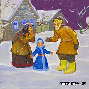 Всякое дело в мире творится, про всякое в сказке говорится. Жили-были дед да баба. Всего у них было вдоволь — и коровушка, и овечка, и кот на печке, а вот детей не было. Очень они печалились, всё горевали. Вот раз зимой пало снегу белого по колено. Ребятишки соседские на улицу высыпали — на санках кататься, снежками бросаться, да и стали снежную бабу лепить. Глядел на них дед из окошка, глядел и говорит бабе: