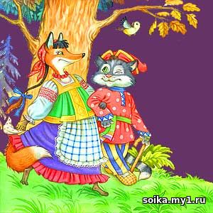 Кот ходил, ходил и набрел на избушку. Залез на чердак и полеживает себе. А захочет есть – пойдет в лес, птичек, мышей наловит, наестся досыта – и опять на чердак, и горя ему мало! Вот пошел кот гулять, а навстречу ему лиса. Увидала кота и дивится: «Сколько лет живу в лесу, такого зверя не видывала!» Поклонилась лиса коту и спрашивает: – Скажись, добрый молодец, кто ты таков? Как ты сюда зашел и как тебя по имени величать? А кот вскинул шерсть и отвечает: – Зовут меня Котофей Иванович, я из сибирских лесов прислан к вам воеводой. – Ах, Котофей Иванович! – говорит лиса. – Не знала я про тебя, не ведала. Ну, пойдем же ко мне в гости. Кот пошел к лисице. Она привела его в свою нору и стала потчевать разной дичинкой, а сама все спрашивает: – Котофей Иванович, женат ты или холост? – Холост. – И я, лисица, – девица. Возьми меня замуж! Кот согласился, и начался у них пир да веселье. На другой день отправилась лиса добывать припасов, а кот остался дома. Бегала, бегала лиса и поймала утку. Несет домой, а навстречу ей волк: – Стой, лиса! Отдай утку! – Нет, не отдам! – Ну, я сам отниму. – А я скажу Котофею Ивановичу, он тебя смерти предаст! – А кто такой Котофей Иванович? – Разве ты не слыхал? К нам из сибирских лесов прислан воеводой Котофей Иванович! Я раньше была лисица-девица, а теперь нашего воеводы жена. – Нет, не слыхал, Лизавета Ивановна. А как бы мне на него посмотреть? – У! Котофей Иванович у меня такой сердитый: кто ему не по нраву придется, сейчас съест! Ты приготовь барана да принеси ему на поклон: барана-то положи на видное место, а сам схоронись, чтобы кот тебя не увидал, а то, брат, тебе туго придется! Волк побежал за бараном, а лиса – домой. Идет лиса, и повстречался ей медведь: – Стой, лиса, кому утку несешь? Отдай мне! – Ступай-ка ты, медведь, подобру-поздорову, а то скажу Котофею Ивановичу, он тебя смерти предаст! – А кто такой Котофей Иванович? – А который прислан к нам из сибирских лесов воеводою. Я раньше была лисица-девица, а теперь нашего воеводы – Котофея Ивановича – жена. – А нельзя ли посмотреть его, Лизавета Ивановна? – У! Котофей Иванович у меня такой сердитый: кто ему не приглянется, сейчас съест. Ты ступай приготовь быка да принеси ему на поклон. Да смотри, быка-то положи на видное место, а сам схоронись, чтобы Котофей Иванович тебя не увидел, а то тебе туго придется! Медведь пошел за быком, а лиса – домой. Вот принес волк барана, ободрал шкуру и стоит раздумывает. Смотрит – и медведь лезет с быком. – Здравствуй, Михайло Иванович! – Здравствуй, брат Левон! Что, не видал лисицы с мужем? – Нет, Михайло Иванович, сам их дожидаю. – А ты сходи-ка к ним, позови, – говорит медведь волку. – Нет, не пойду, Михайло Иванович. Я неповоротлив, ты лучше иди. – Нет, не пойду, брат Левон. Я мохнат, косолап, куда мне! Вдруг – откуда ни возьмись – бежит заяц. Волк и медведь как закричат на него: – Поди сюда, косой! Заяц так и присел, уши поджал. – Ты, заяц, поворотлив и на ногу скор: сбегай к лисе, скажи ей, что медведь Михайло Иванович с братом Левоном Ивановичем давно уже готовы, ждут тебя-де с мужем, с Котофеем Ивановичем, хотят поклониться бараном да быком. Заяц пустился к лисе во всю прыть. А медведь и волк стали думать, где бы им спрятаться. Медведь говорит: – Я полезу на сосну. А волк ему говорит: – А я куда денусь? Ведь я на дерево не взберусь. Схорони меня куда-нибудь. Медведь спрятал во