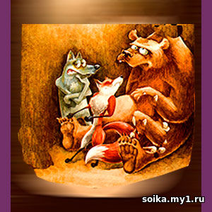 — Петушок, петушок! Беда! Бояре наехали, палят, стреляют, нас убивают! Бежим отсюда! И побежали. Бежали, бежали. Им навстречу — заяц: — Куда, петушок, бежишь? — Ай, не спрашивай меня, спрашивай курочку! — Куда, курочка, бежишь? — Бояре наехали, палят, стреляют, нас убивают! — Возьмите меня! И побежали втроем. Им навстречу — лиса: — Куда, зайчик, бежишь? — Не спрашивай меня, спрашивай петушка! — Куда, петушок, бежишь? — Ай, не спрашивай меня, спрашивай курочку! — Куда, курочка, бежишь? — Бояре наехали, палят, стреляют, нас убивают! — Возьмите меня! И побежали вчетвером. Им навстречу — волк: — Куда, лиса, бежишь? — Не спрашивай меня, спрашивай зайца! — Куда, зайчик, бежишь? — Не спрашивай меня, спрашивай петушка! — Куда, петушок, бежишь? — Ай, не спрашивай меня, спрашивай курочку! — Куда, курочка, бежишь? — Бояре наехали, палят, стреляют, нас убивают! — Возьмите меня! И побежали впятером. Им навстречу — медведь: — Куда, волк, бежишь? — Не спрашивай меня, спрашивай лису! — Куда, лисичка, бежишь? — Не спрашивай меня, спрашивай зайца! — Куда, зайчик, бежишь? — Не спрашивай меня, спрашивай петушка! — Куда, петушок, бежишь? — Ай, не спрашивай меня, спрашивай курочку! — Куда, курочка, бежишь? — Бояре наехали, палят, стреляют, нас убивают! — Возьмите меня! И побежали вшестером. Бежали, бежали да в глубокую яму и упали. Долго они в яме сидели, есть захотели, а выйти не могут. Вот лиса и говорит: — Давайте имена спрашивать! Чье имя хуже, того и съедим. И запела лиса: — Медведь-медведyхно — имечко хорошее. Лиса-олисaва — имечко хорошее. Волк-волчyхно — имечко хорошее. Заяц-зайчyхно — имечко хорошее. Петух-петушyхно — имечко хорошее. Кура-окурaва — имя худое! Тут курочку и съели. Прошло немного времени — опять есть хочется. Лиса запела: — Медведь-медведyхно — имечко хорошее. Лиса-олисaва — имечко хорошее. Волк-волчyхно — имечко хорошее. Заяц-зайчyхно — имечко хорошее. Петух-петушyхно — имя худое! И съели петушка. Посидели — опять есть захотели. Лиса запела: — Медведь-медведyхно — имечко хорошее. Лиса-олисaва — имечко хорошее. Волк-волчyхно — имечко хорошее. Заяц-зайчyхно — имя худое! Съели и зайца. Долго ли, коротко ли, опять есть захотели. Лиса запела: — Медведь-медведyхно — имечко хорошее. Лиса-олисaва — имечко хорошее. Волк-волчyхно — имя худое! Разорвал медведь волка. Стали они с лисой есть. Лиса часть съела, а другую-то припрятала. Сидели-сидели, опять проголодались. Лиса потихоньку начала есть припрятанное, а медведь спрашивает: — Чем, лисанька, лакомишься? — Кишочки свои достаю и ем. — А как ты их достаешь? — Распорола брюхо и достаю. Медведь поверил и распорол себе брюхо. Осталась лиса одна в яме. Прошло немного времени, летит мимо птичка-синичка. Лиса кричит ей: — Птичка-синичка, выручи меня из беды! — А как я тебя выручу? — Наноси в яму веток! Наносила птичка-синичка в яму веток, и выбралась лисица на волю. | |