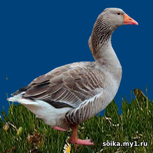 Цель разведения: продуктивная порода, с очень хорошими мясными качествами. Порода выведена одновременно в совхозе «Арженка» Тамбовской области России, и в Украинском научно-исследовательском институте птицеводства; в связи с чем различают два внутрипородных типа – тамбовский степной и борковский. Живая масса: гусак 7 - 9кг, гусыня 6 - 8кг. Голова: средней величины; короткая и широкая, без четко выраженного лба и мускул щек. Глаза: темно-коричневые. Веко оранжевого цвета. Клюв: короткий, толстый, оранжево-красного цвета. Кончик розовый. Шея: средней длины, относительно толстая, с легким изгибом в верхней части. Туловище: широкое, глубокое, слегка приподнятое. Грудь: глубокая, широкая. Живот: пышно развитый, широкий, с хорошо развитой двойной складкой, сомкнутой сзади. Спина: средней длины, очень широкая, слегка выпуклая, с небольшим наклоном к хвосту. Крылья: хорошо развитые, плотно прижатые к корпусу, немного скрещивающиеся на концах. Хвост: короткий и широкий, почти горизонтально поставленный, мало выступающий. Голени: хорошо развитые, немного выступающие. Плюсны: средней длины, крепкие, широко расставленные, оранжево-красного цвета. Оперение: обильное, но плотно прилегающее. Гусыня: немного меньших размеров, чем гусак, с более короткой шеей, вследствие чего пышная нижняя часть кажется более приземистой и короткой. Окраска оперения: голова, верхняя часть шеи и спина темно-серого цвета, грудь светло-серая. Оперение плеч, голеней и маховых имеет тонкую белую не слишком широкую кайму. Рулевые серые с белым окаймлением. Живот и нижняя часть белые. Яйценоскость 35-45 яиц в год, при двух циклах яйцекладки до 60. Стандартная масса яйца 175г. Окраска скорлупы белая. Яйценоскость с апреля-мая происходит снижение оплодотворенности. Вывод гусят 55-60%. К 60-дневному возрасту, масса гусят достигает 4,0-4,5кг. Птица хорошо насиживает и водит гусят, эффективно использует пастбища. Масса жирной печени 350-450г. Общее впечатление: крупный гусь, серой окраски оперения, крепкого телосложения, с двойной складкой на животе, красно-оранжевыми лапами и клювом, подвижного поведения. Грубые недостатки окраски: не четко выраженный чешуйчатый рисунок на спине и крыльях, белые маховые и белое окаймление клюва. Допустимые недостатки: одиночная складка на животе. Недопустимые недостатки: недостаточная живая масса, кошелек под клювом или шишка на лбу, плохо развитая складка на животе, чересчур высокая постановка корпуса, плоская, острая грудь, бледный цвет клюва и плюсен. | |