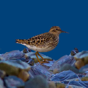 Песочник-крошка (лат. Calidris minutilla) — самый маленький из куликов. Видовое название minutilla происходит от обозначения «очень маленький» на средневековой латыни. Для этого песочника характерны зеленоватого цвета ноги и короткий, тонкий, темный клюв. Взрослые особи в сезон размножения имеют коричневую спину с темно-коричневыми пестринами и беловатый низ. Для них характерна светлая бровь и тёмная шапочка (или корона). Зимой, песочники-крошки серые сверху. Молодые сверху раскрашены ярко, рыжая окраска центральной части перьев контрастирует с белыми оторочками кроющих мантии, формируя своеобразный рисунок. Этот вид бывает сложно отличить от других подобных мелких песочников. В частности, песочник-крошка очень похож на своего азиатского аналога, длиннопалого песочника. Он отличается от этого вида в более компактным обликом, более короткой шеей, более короткими пальцами, несколько более тусклыми цветами и более отчётливой полоской на крыле. В России были лишь две достоверные встречи этого вида. 15 июня 1986 года у Колючинской губы на севере Чукотского полуострова (наблюдение Павла Томковича) и 16 мая 2015 года в бухте Провидения там же (наблюдения Максима Антипина). Гнездовой биотоп — это тундра или болота на севере североамериканского континента. Песочники-крошки гнездятся на земле рядом с водой. Самка откладывает четыре яйца в неглубокой ямке, выстланной травой и мхом. Для этого вида характерна моногамия, насиживают кладку также оба родителя. Однако при выводке часто остаётся только один самец, хотя зарегистрированы и случаи сопровождения выводков гнездовой парой. Молодые птицы питаются самостоятельно и встают на крыло через две недели после вылупления. Эти птицы кормятся на илистых площадях, подбирая пищу с помощью зрения и иногда, используя зондирование. В основном, они питаются мелкими ракообразными, насекомыми и улитками. | |