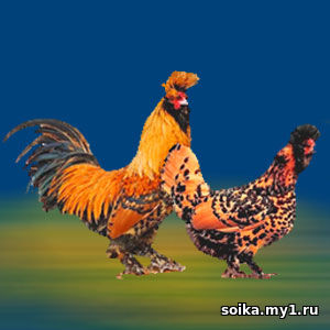 Павловская золотистая порода кур считается первой породой домашних кур, выведенной в России. Считается, что порода существует более 300 лет, однако стандарты установлены только к 1905 году. Впервые представлены публике на II всероссийской акклиматизационной выставке в Москве. Названы по селу (ныне город) Павлово в Нижегородской области. После революции порода сошла на нет и долгое время считалось утерянной, пока в -е годы не начались работы по её восстановлению. Есть две основные разновидности породы — Павловская золотистая и Павловская серебристая. Куры павловской породы отличаются хорошей холодостойкостью и прекрасно переносят морозы. Павловских кур разводят в основном для декоративных целей, их яйценоскость невелика: порядка 70 - 90 яиц в год. В 1899 году павловские красавицы были занесены в книгу национальных птичьих пород. Их снова стали активно выращивать. Но подобная ситуация продлилась недолго. Революция 1917 года и ее последствия – раскулачивание, Гражданская война, нанесли породе серьезный урон. Птиц перестали разводить, следить за их соответствием эталонным показателям. После революции порода сошла на нет и долгое время считалось утерянной, пока в 1980 -е годы не начались работы по её восстановлению. Профессиональные птицеводы долгое время скрещивали европейских фаверолей, турецких султанок, голландских кур, и наконец-то смогли добиться возрождения эталонной павловки. Голова. свободно закругленная, маленькая, шлемовидный сжатый хохолок, красивый воротничок, Сейчас заводчиками выращиваются птицы с разным цветом перьев. Наибольшей популярностью пользуется павловская золотистая порода. Ее разводят чаще всего. Она характеризуется: Павловки – скороспелая порода яично-мясного направления. Ее продуктивные показатели приведены далее: Вкусное и нежное деликатесное мясо с небольшим количеством жира, которое легко усваивается организмом взрослых и детей. Яйца павловская порода начинает нести в возрасте 6 – 7 месяцев. Продуктивность процесса не изменяется на протяжении 4,5 – 5 лет. Павловки несут яички даже зимой, правда, в меньших количествах, в отличие от большинства других куриных пород. Павловская золотистая. Они необычайно эффектны. Оперение птиц имеет основания темно-золотого или красноватого оттенка, а окончания их украшены темными пятнышками правильной формы. На определенных частях тела (хохол, крылья, поясница, шея, плечи) – они остроугольные и повторяют форму латинской буквы V. На солнечном свете перья птиц радуют глаз ярким и интенсивным блеском. | |