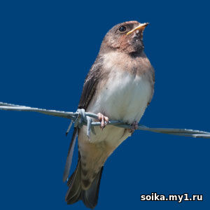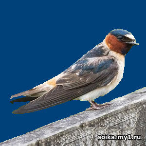 Ласточки улетают в три раза, в три спаса В.И.Даль Месяцеслов Ласточковые (лат. Hirundinidae) — богатое видами семейство воробьинообразных. Для ласточковых характерна способность добывать пищу в воздухе, они в состоянии ловить насекомых на лету. У ласточковых стройное, обтекаемое телостроение и длинные узкие крылья. Клюв короткий и открывается довольно широко. Лапки весьма маленькие, у большинства видов длинные хвосты. Ласточки являются перелётными птицами. Гнёзда под выступами, под крышами и под мостами. По виду гнёзда похожи на бутылки, они слеплены из глины и прикреплены вплотную друг к другу. За один сезон у пары ласточек может быть до 3 выводков. В кладке в среднем 4—5 яиц с белой в крапинку скорлупой. Самка насиживает кладку около 16 дней. Вылупившиеся птенцы будут находиться под опекой своих родителей около недель, после чего покинут гнездо. Масса тела составляет 17-27 г. Длина туловища — 13-15 см. Голова маленькая и немного сплюснутая, как и у всех ласточек. Туловище стройное и удлинённое. Крылья узкие. Хвост прямой. Лапы короткие и четырёхпалые. Линька проходит 1 раз в году. У взрослых особей верх головы тёмно-синий, а на лбу есть белое пятно, по которому можно однозначно идентифицировать данный вид. Щёки и шея красные. Спина, хвост и крылья темно-синие. Брюшко белое. Зашеек и надхвостье окрашены в светло-оранжевый цвет. В России этот вид зарегистрирован в Чукотском автономном округе. Одна из самых маленьких представительниц семейства ласточковых, её длина составляет 12—13 см, а размах крыльев 25—28 см; однако она несколько крупнее близкой ей малой ласточки (Riparia paludicola). Масса особи составляет 11—16 г. Оперение верхней части тела серовато-бурое, при этом маховые перья первого порядка крыльев выглядят несколько темнее. Кроющие перья крыльев также достаточно тёмные (заметно темнее аналогичных перьев малой ласточки). Нижняя часть тела преимущественно грязно-белая; между белыми горлом и брюхом имеется широкая серовато-бурая поперечная полоса (у малой ласточки такая полоса отсутствует). Клюв короткий, широкий и твёрдый. Хвост длинный, узкий, без белых пятен (как, например, у скалистой или африканской скалистой ласточек), со слабой выемкой на конце. Молодые птицы выглядят более рыжими в верхней части и желтоватыми снизу. Полёт быстрый, лёгкий, плавный, обычно на небольшой высоте — часто над водой. Голос — резкий, глухой звук, что-то вроде «чррррш». Также может издавать длинную трель — череду глухих звуков. Обитает вдоль обрывистых берегов рек с достаточно мягким грунтом, на открытых лугах, у песчаных или щебёночных карьеров, недалеко от водоёмов. Во время зимней миграции также держится недалеко от воды. Береговушка является перелётной птицей независимо от территории, где обитает; однако временные рамки миграции заметно различаются. В средней полосе России к местам гнездовий первые ласточки прилетают в первой половине мая, а основная масса — только во второй половине этого месяца. Береговушки моногамны (то есть на одного самца приходится одна самка), чаще всего гнездятся большими колониями до 1500 пар, что считается рекордом среди всех ласточек. Ранее имелись сообщения и о колониях до 3000 пар. Тем не менее известны редкие случаи и одиноко гнездящихся пар. Для гнезда строится нора на высоком обрывистом берегу большого водоёма (реки, озера, океана и т