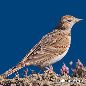 Жаворонок явится к теплу, зяблик – к стуже В.И.Даль Земледелие Птица длиной 14 см и тем самым меньше полевого жаворонка. Её макушка коричневая, а нижняя сторона светлая. Как быстрый летун этот жаворонок часто уклоняется от районов с плохими метеоусловиями . Живёт, прежде всего, в южной Европе, в России, на полях под паром, пастбищах, в полупустынях и песчаных областях. Также распространены в Передней, Средней и Центральной Азии, в Северной и Восточной Африке. В северных районах ареала эти птицы встречаются только на гнездовье, а на зиму улетают в теплые страны. На остальной территории ареала они ведут оседлый образ жизни. Пение, как и у всех жаворонков, служит для привлечения самок. Поёт, сидя на земле, или летая на небольшой высоте. Птица гнездится на земле. Её глубокое гнездо в форме чаши часто скудно укрыто от лучей солнца или от глаз врагов в зарослях растений. Гнездится на земле, откладывая от двух до трёх яиц. Птенцы покидают гнездо, когда они ещё не умеют летать. Вылупившихся птенцов с рассвета и до сумерек кормят родители, прилетая с кормом к гнезду до 180—200 раз в день (вместе). При этом в середине дня, когда солнечные лучи становятся особенно жгучими, число прилетов заметно сокращается, а иногда на некоторое время взрослые птицы перестают кормить птенцов совсем. В это время самка иногда садится на гнездо с птенцами, чтобы предохранить их от перегрева. Питание как животного, так и растительного происхождения. Летом птицы питаются, прежде всего, мелкими насекомыми, в первую очередь мелкими жуками и муравьями, а также другими беспозвоночными, такими как пауки и маленькие улитки. В растительном рационе преобладают семена злаков и гречишных. Так как малый жаворонок почти единственный многочисленный представитель насекомоядных птиц невозделываемых открытых пространств, он, по-видимому, весьма полезен уничтожением вредных насекомых в местах их естественной резервации, откуда они в случае массового размножения могут переходить на соседние возделываемые поля. | |