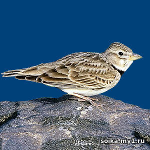 Жаворонок явится к теплу, зяблик – к стуже В.И.Даль Земледелие Это крупные жаворонки 19—22 см в длину с невзрачной окраской. Окрашены в коричневый цвет сверху и белый снизу с двумя крупными чёрными пятнами на груди. Размах крыльев составляет 36-44 см. Масса 55-75 грамм. По заднему краю крыла белая полоса (заметная только в полёте), крайние рулевые перья также белые. Для гнездования эти птицы предпочитают открытые пространства, такие как степи. Вид моногамен и откладывает яйца с начала апреля по июль. Гнездо строится из стеблей травы и маленьких листьев, выстилается более мягким материалом и строится в неглубокой впадине на земле, часто под кочкой. В кладке обычно 4—5 яиц. Главной пищей этих птиц является зерно. Во время брачного периода их «меню» дополняется также и насекомыми. Песня напоминает песню полевого жаворонка, но громче. | |